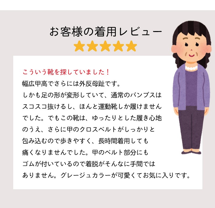 nonさん 30才 靴サイズ:25cm 身長:165cm 足幅:4E~5E 足囲:26cm 幅広甲高・外反母趾は無 |