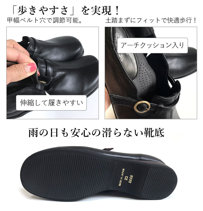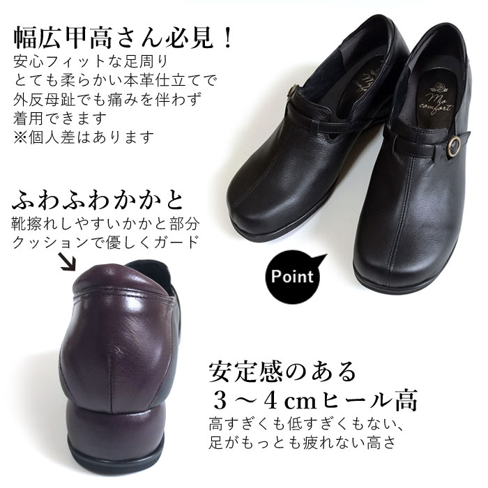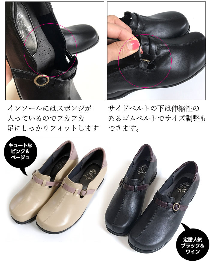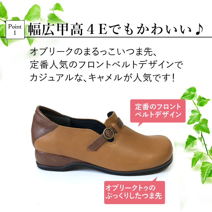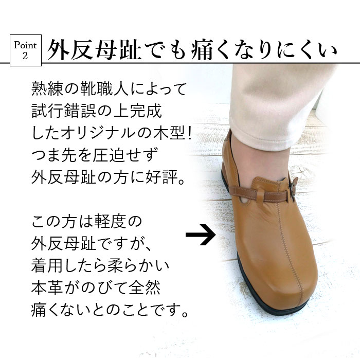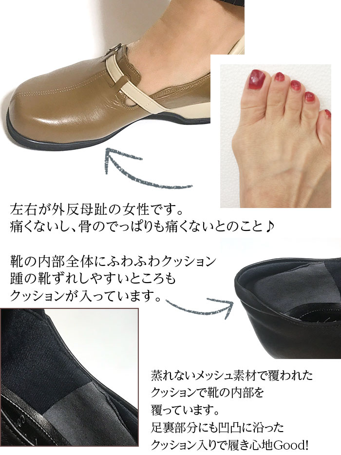 ★スタッフの着用レビュー Aさん(45才 幅広、外反母趾なし) 普段は23cmを履いています。私は外反母趾ではないので、どこも当たらず快適です。いつもは幅広なためパンプスの場合はちょっと大きめの23.5cmにして中にクッションなどを入れて調整していますがこの靴はその必要が全くない感じです。 Kさん(28才 幅広甲高、軽度の外反母趾) この靴は私の幅広甲高の足で履くとちょっときつめだったのでベルトの穴を少し緩めてみたところピッタリになりました。 外反母趾の部分がぽこっと出っ張りますが革が柔らかいのか痛くはないです。 でももし長時間歩いてたら痛くなる不安もあるので、私の場合は同じデザインで5Eがあるのでそちらの方がよさそうでした。デザインはとてもかわいくてキャメルブラウンはジーンズで履くとカジュアルで素敵でした。ピンクベージュも春先に白系の服に合わせて着てみたいです! |