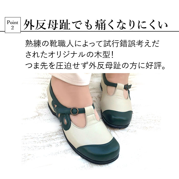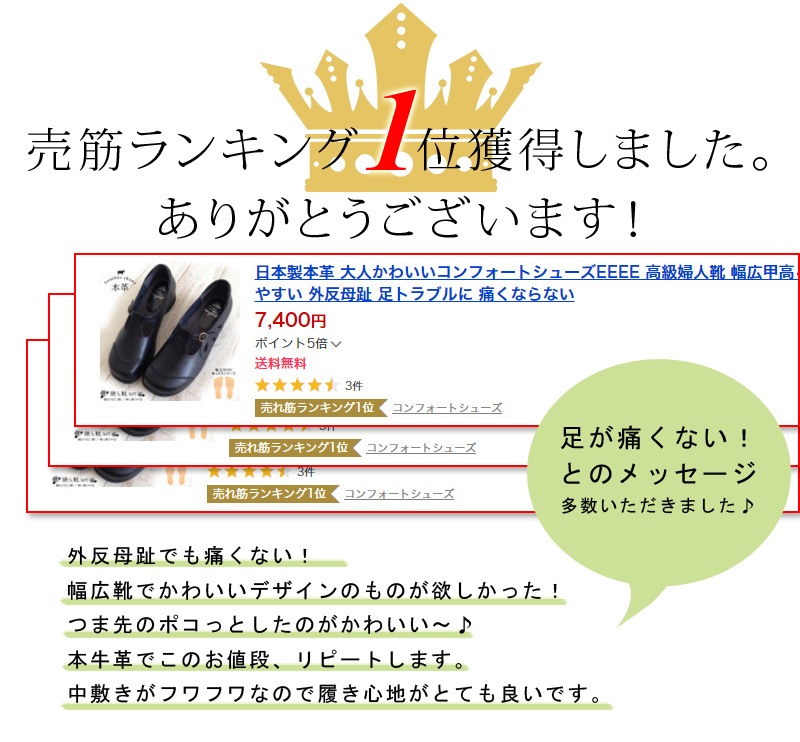 外反母趾の私の足に合う靴がなかなか見つからなかった。着いてすぐに、履いてみたらまるで自分の足に合わせたような靴に初めてであった。足が喜んでいる感じ。これからもこちらの靴を利用したいです。 本当に感激してます。ありがとうございました。
