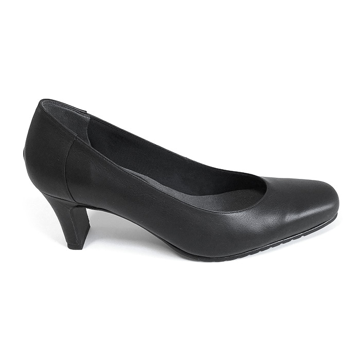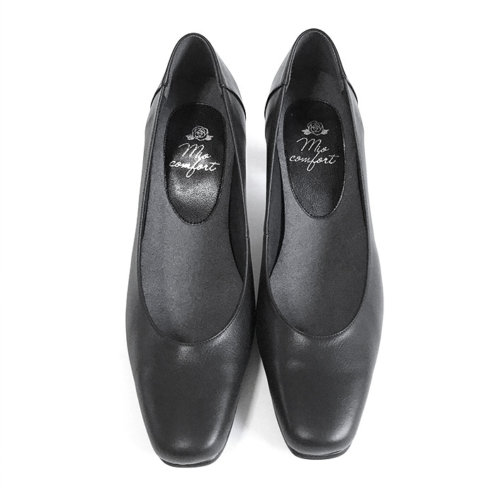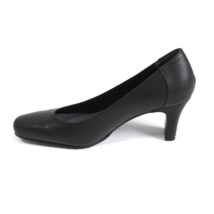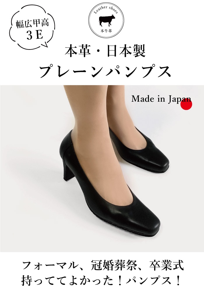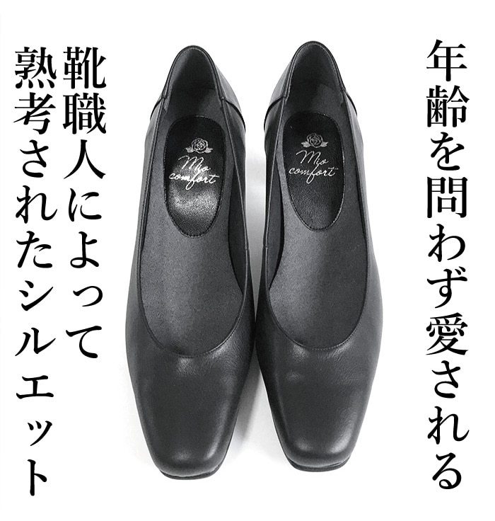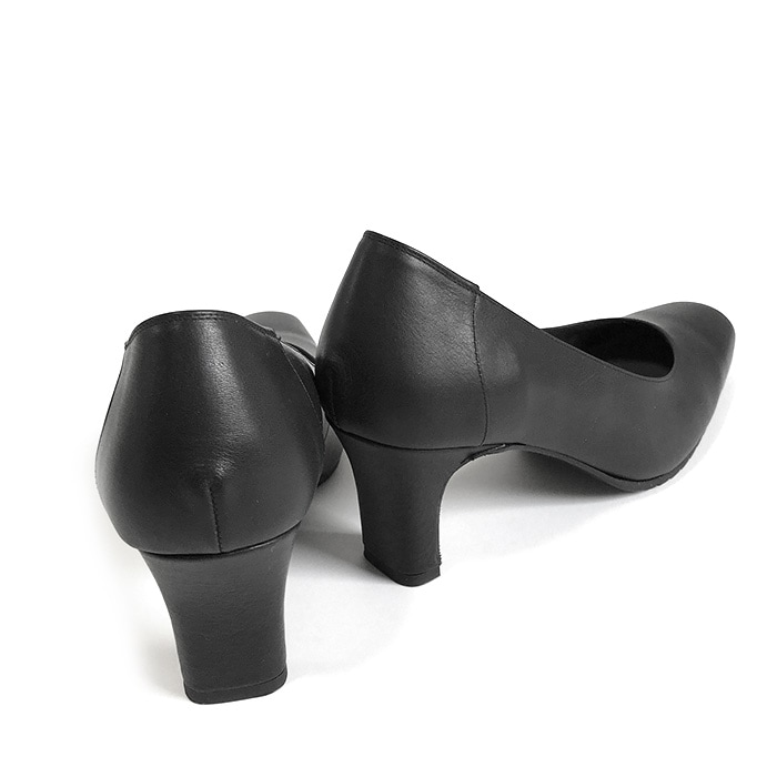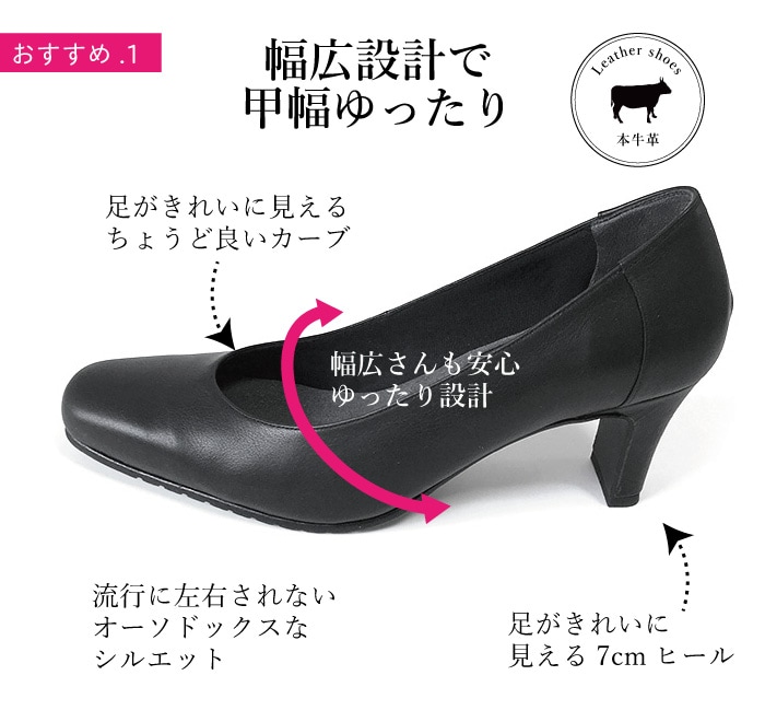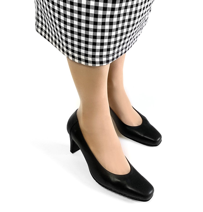 上品な本革パンプスのブラック。フォーマルにもオフィスにも、普段履きにと幅広く活躍します!
