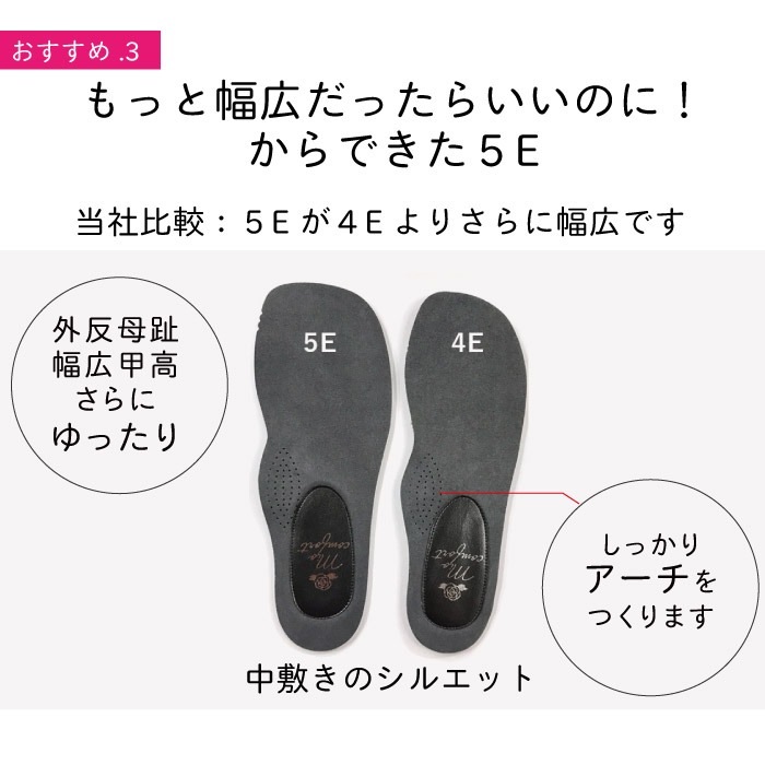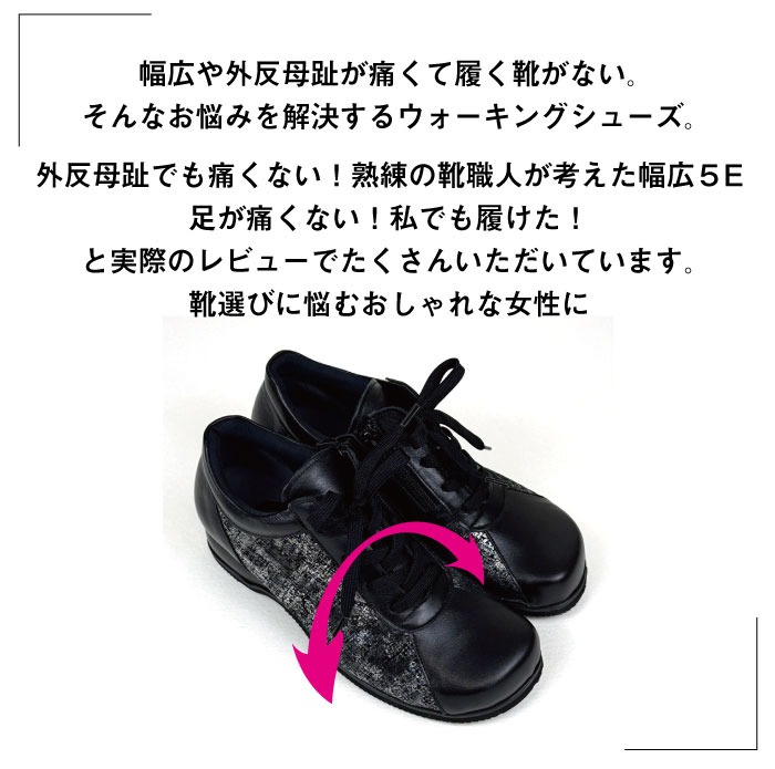 甲高幅広、外反母趾が年々酷くなり靴選びが大変でした。はじめて購入した5Eパンプスがとても良かったので、今回はウォーキングシューズを! 全然痛くならず楽々歩けます。幅広に見えないのがいいです。 また他の靴もほしくなりました(^^)