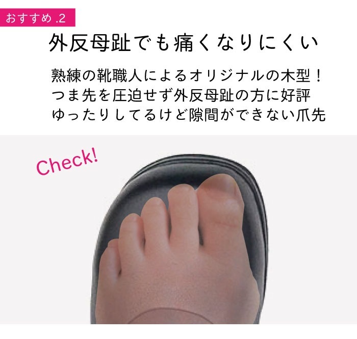 ひどい外反母趾で親指に押されて人差し指が浮いているので、幅が良くても浮いた指の背が靴にあたって履ける靴がなく、探すこと数か月。ここにたどり着きました。 この靴は甲高かなのと、皮が柔らかで浮いた指に沿ってくれるのでぎりぎりセーフで購入をきめました。ただ年寄りにはヒールが少し高いので慣れるには少しかかりそうです。3㎝くらいのヒールとカスタマイズ対応できるよう検討していただけると嬉しいです。でも、とりあえず履ける靴が見つかって感謝です。