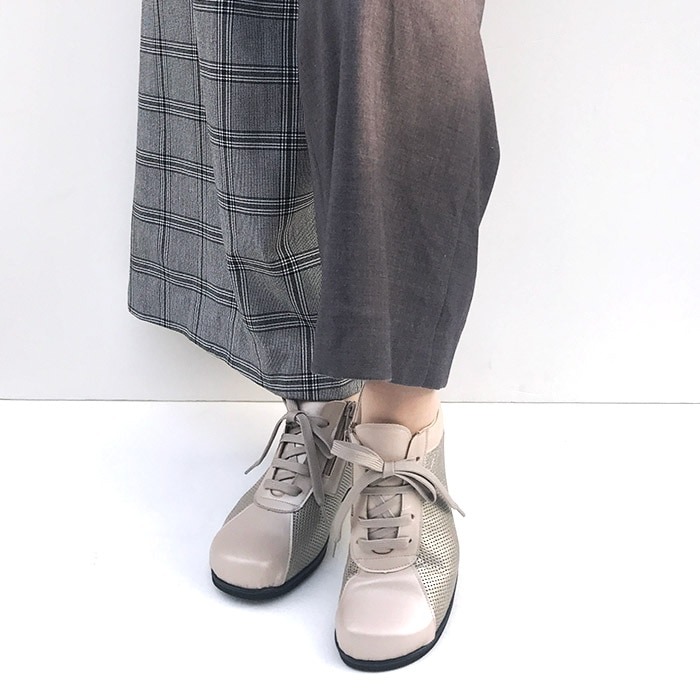 サイドに細かいパンチング加工が施された本革をあしらった少し暑い時期向けの靴です。