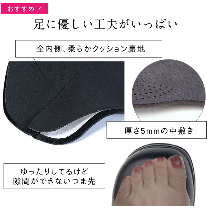 | 爪先に少しゆとりのあるサイズ感。やわらかい素材&履き口にゴムがあるのでスッと履けます。 かかとや内側にクッションがあるので、沢山歩いても疲れません! |