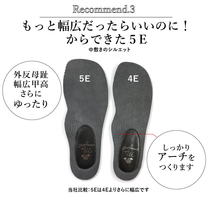 本日届きました。他で見ない色の組み合わせ(緑白)が可愛いのと5Eにひかれて購入。外反母趾を全く気にしなくていいのとまるで靴を履いてないかのように楽チン。5Eの場合もしかしたらひとつサイズを下げたほうがいいかもしれません。私は普段24.5ですが、4Eのときはそのサイズでよかったけど少しブカブカするので次は24センチを注文しようと思います。あとストラップがゴムになっているのですっぽりと履きやすい。以前マジックテープのを購入して、靴は全くどうもないのに、マジックテープ部分がダメになったので、マジックテープ部分だけのリペアとかあるといいのになぁと思ったりしています。引っ掛けるタイプを最近よく見かけるけど歩いてる途中とれるんですよね。ホックというかパチッととめるタイプの靴って今はないのかしら?とにかくゆったりと痛くないからおすすめ。外反母趾だけど4Eでも良いくらいかな?という感じです。手作りされてるとのことですので、ほんとうに長持ちします。余った革とかで、お花をつくって靴に縫い付けて可愛い感じの靴もあったら嬉しいです。ゆったり靴をつくり続けて下さってありがとう御座います。また注文しますね。
