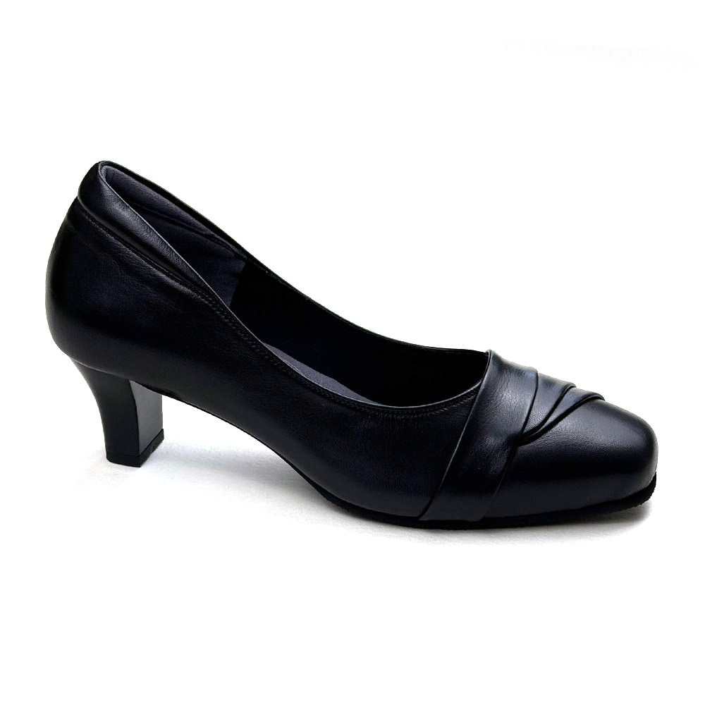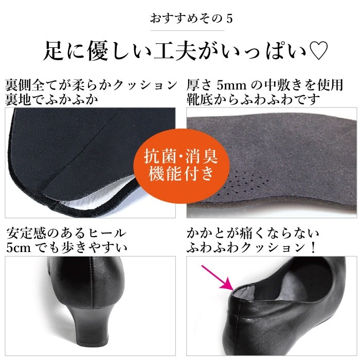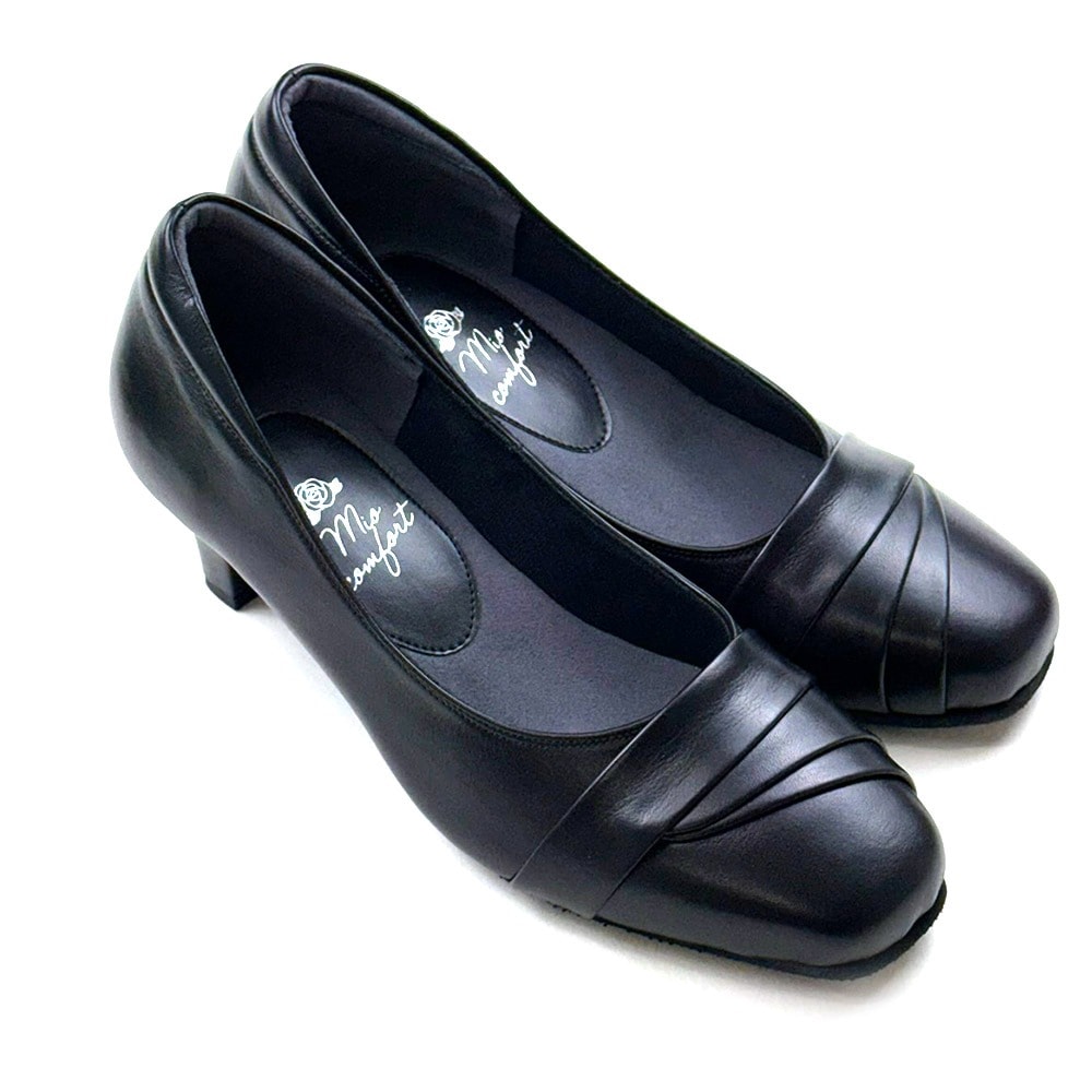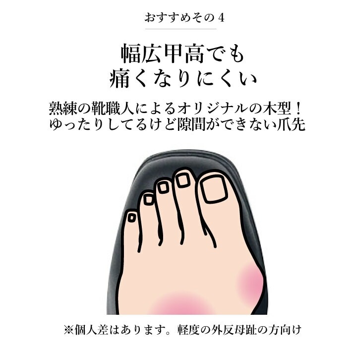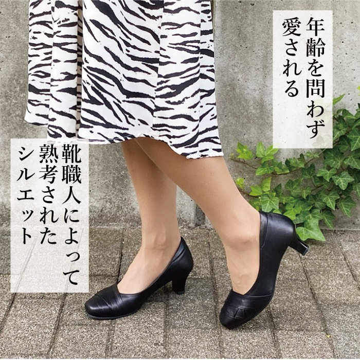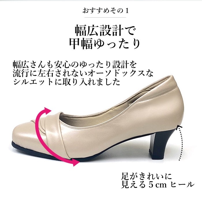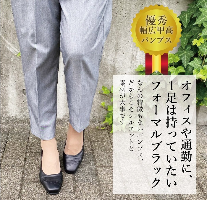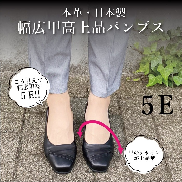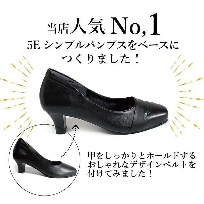 そこでおすすめなのが、熟練の靴職人が考え抜いた幅広甲高設計の5E黒パンプス。当店で大人気の5Eシンプルパンプスをベースに、さらにおしゃれ度と快適さを追求して作られました。