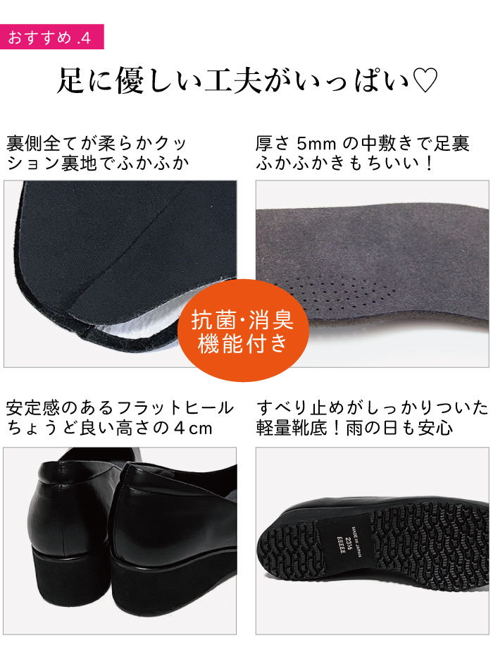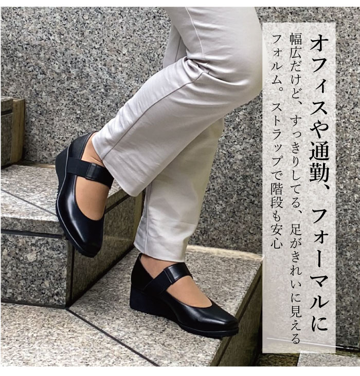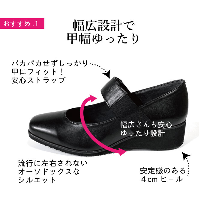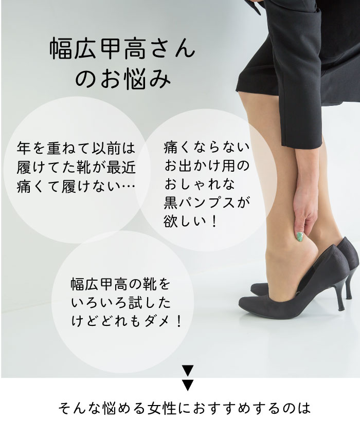 求めていた靴でした。幅広い靴はもったりしているデザインが多いですが、そうではなく、はき心地も良いです。色違いで欲しくなりますが、肌馴染みの良い色のはヒールが黒になります。同じ色の差ヒールだと尚いいと思いますが、こだわりのヒールではなくなってしまうのでしょうね。
