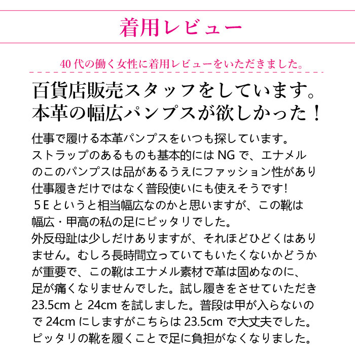 こんなパンプスが欲しかったんです。外反母趾があります。市販の靴は、無理です。ヒールの高さもよかったです。これから活躍する一足となりました。