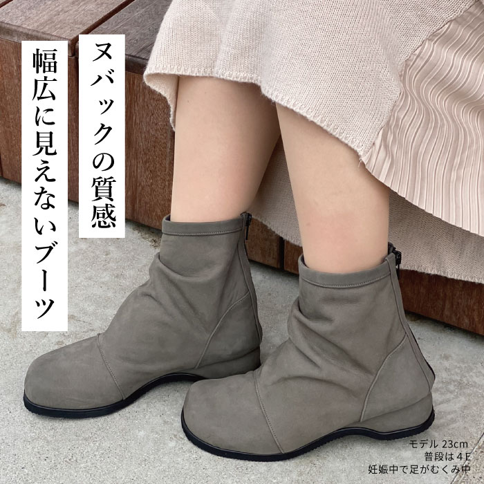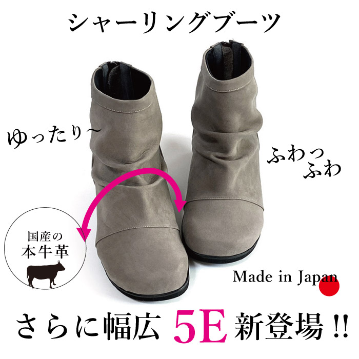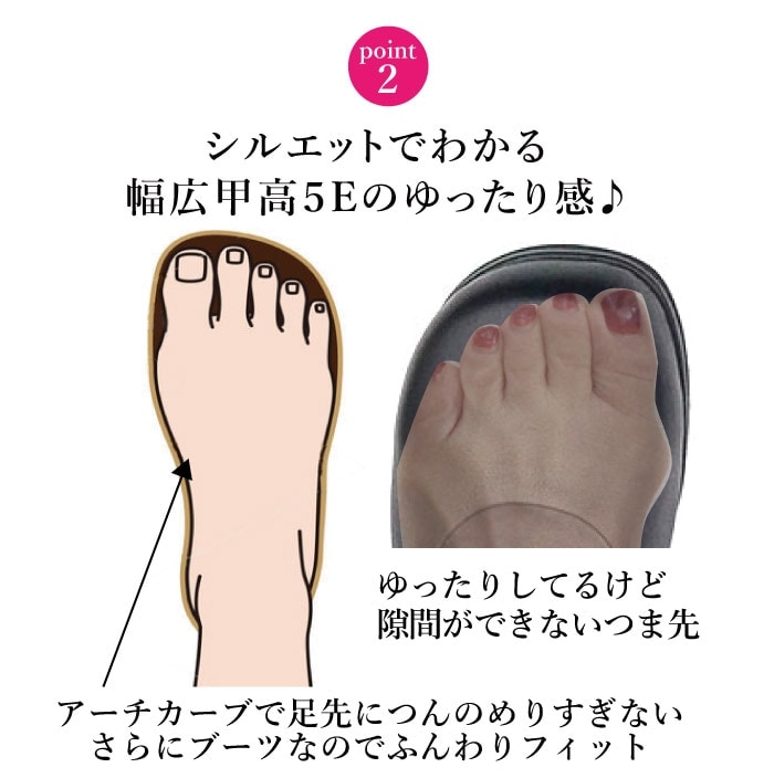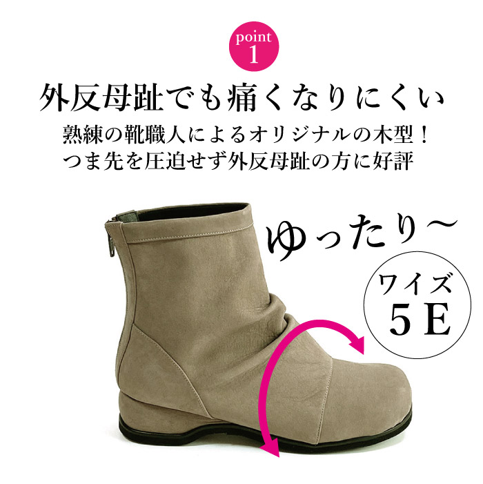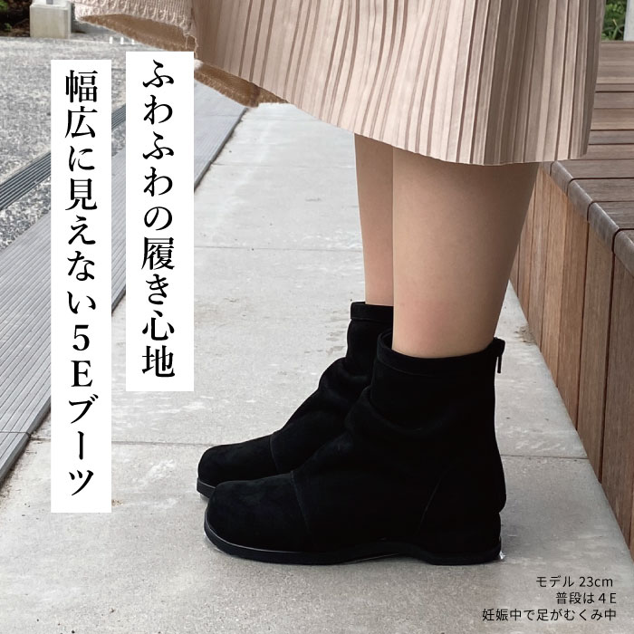 足が大きく幅広で甲高、靴選びに悩んでいますが、こちらでパンプス2つ購入して良かったので、5Eブーツに初挑戦。しっかり幅広なのに、そう見えない、デザイン可愛く、足もキレイに見えます。すごく嬉しいです。2足目検討してます。