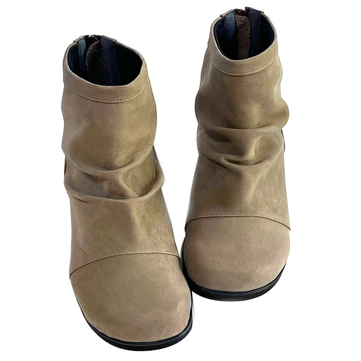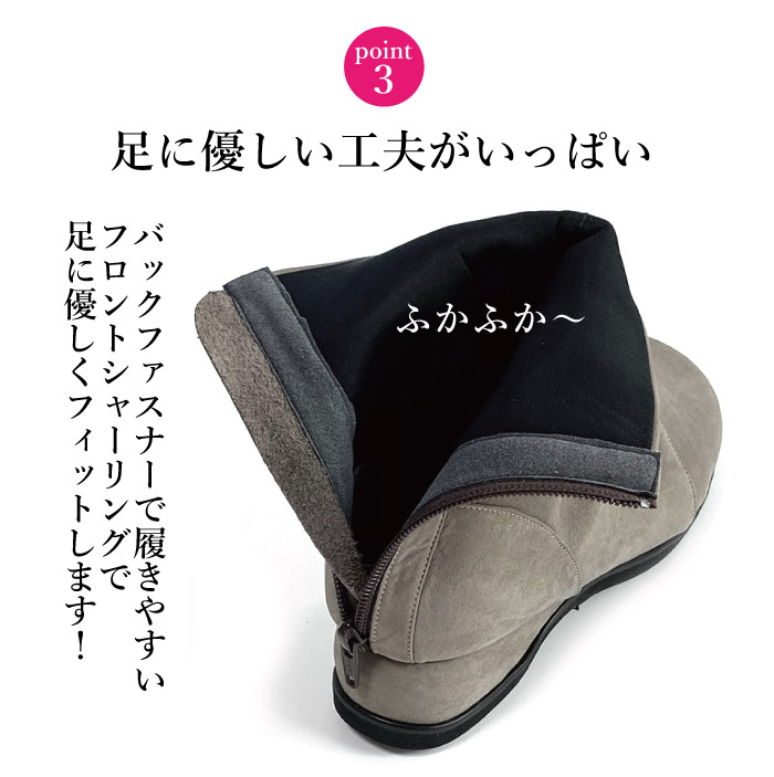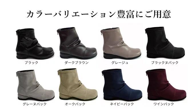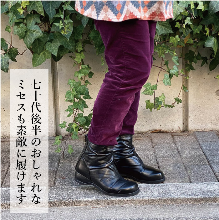 持病で左足が特にむくんでしまい、なかなかサイズが合うオシャレなブーツがない私にも履けるブーツにやっと出逢いました!! 幅広くても全く窮屈に感じたら痛くなったりしません。 ただ、後ろのチャックにチャックがあるためなれるまで、ちょっと手間取りそうです。 後ろにチャックタイプと横にチャックタイプの2種類あって選べるといいですね!! 色味も選べて、また追加で購入しようか迷っています。 あと1つ追加で、雪国に住んでいるので、底が滑らないゴムもあると安心してすふむも