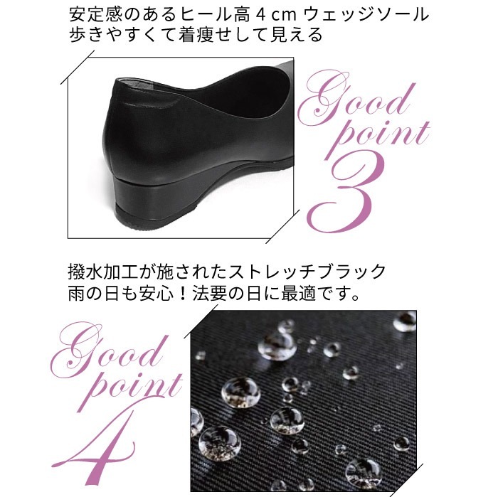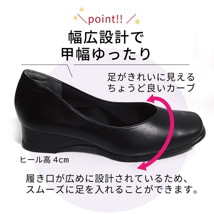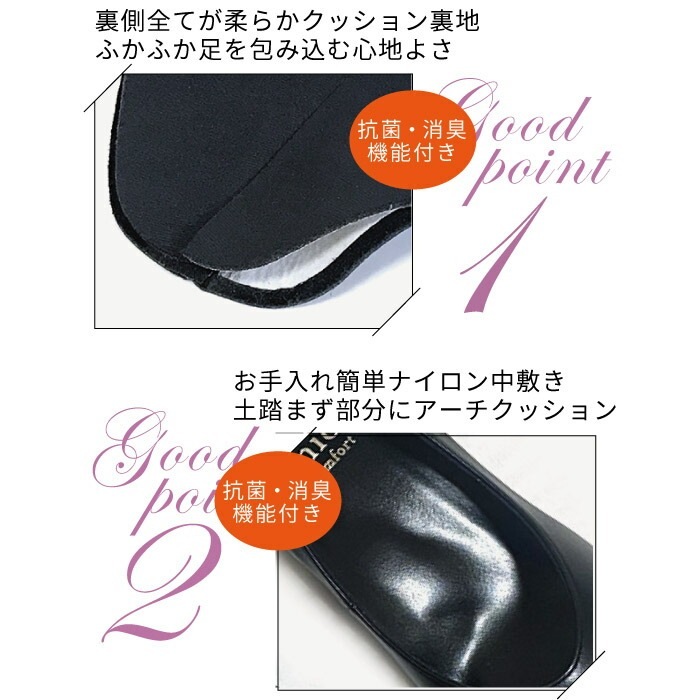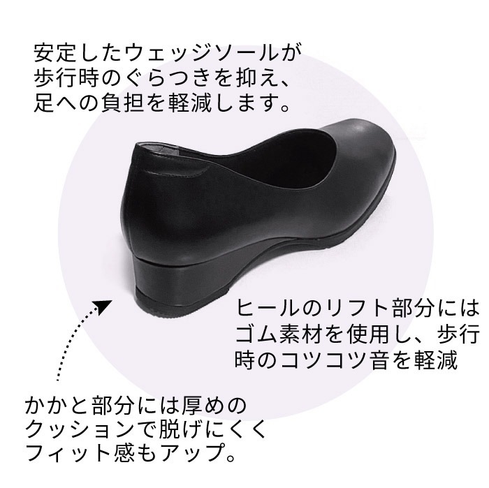 さらに、ヒールのリフト部分にはゴム素材を使用し、歩行時のコツコツとした音を軽減。機能性とデザイン性を兼ね備えた、快適で洗練された一足です。