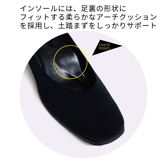 インソールには、足裏の形状にフィットする柔らかなアーチクッションを採用し、土踏まずをしっかりサポート。歩行時の足のぐらつきを抑え、負担を軽減します。さらに、かかと部分には厚めのクッションを内蔵し、脱げにくくフィット感もアップ。