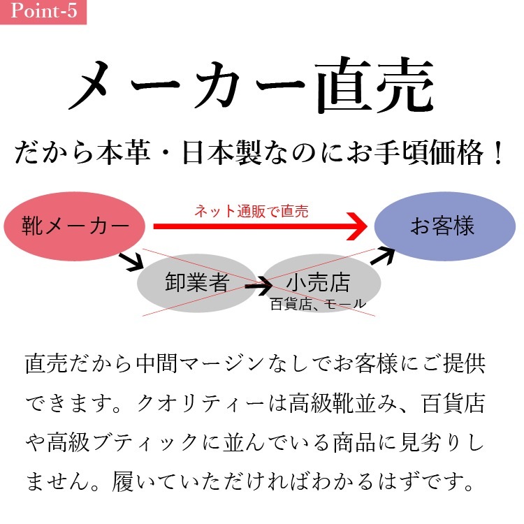 日本国内の昔ながらの靴職人さんたちが丹精込めてひとつひとつ丁寧に創っています。